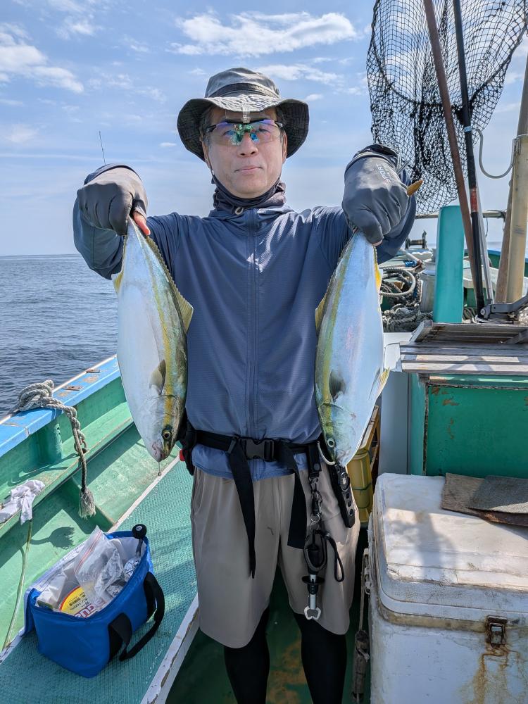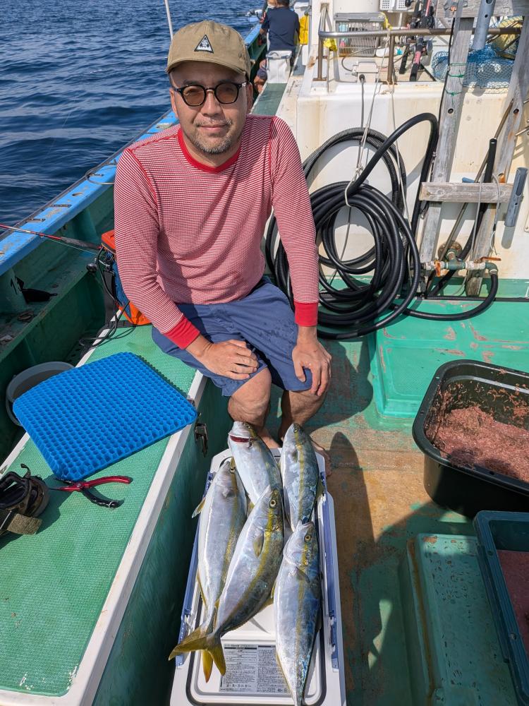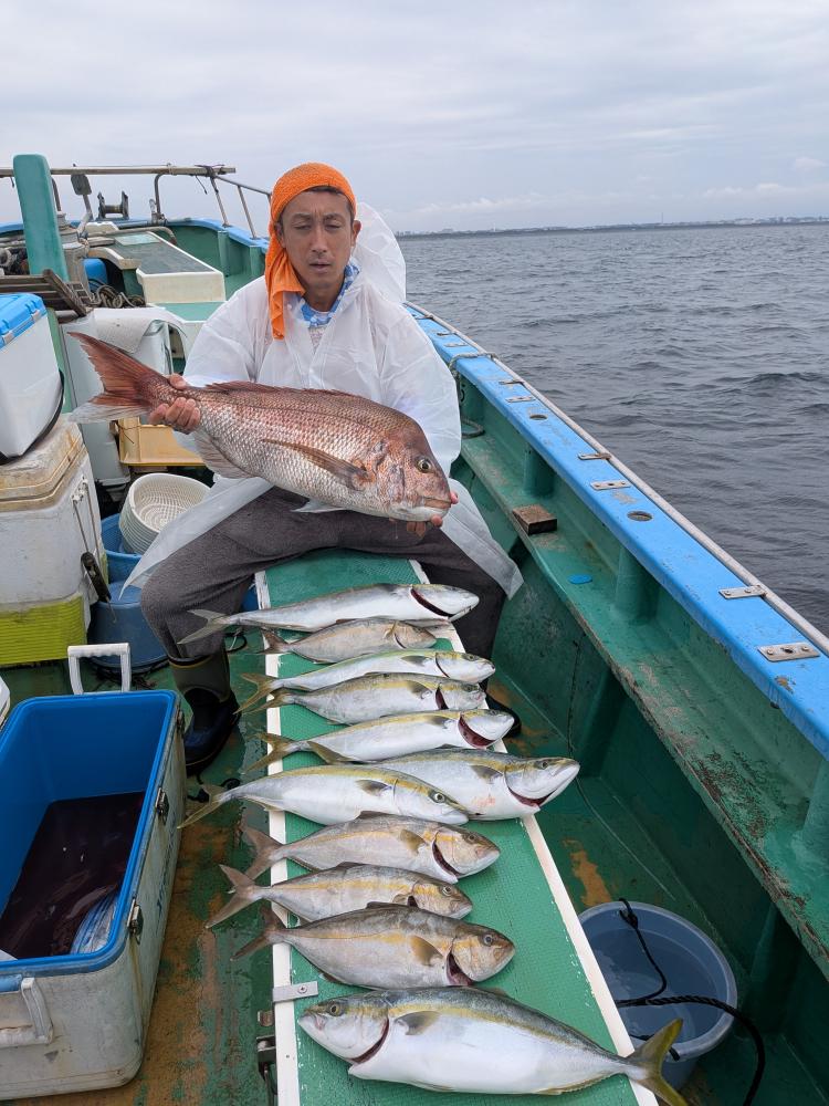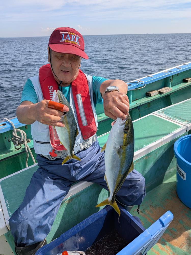 今日はビギナーさんのみで親子連れのお客様とルアーとサビキのお客様のみでコマセ効かない状況でしたが親子連れのお客様はお子様はサビキ食わせ、お父様は天秤シャクリでやって頂きお二人様共にたまには良型イナダゲット出来ました。ルアーとサビキのお客様はルアーでカンパチ4匹でサビキではイナダもポチンポチンとアタリ、スペシャルゲストにマダイ6.5キロ、ワラサもゲット出来て、両者共にクーラー満タンで少し早めの帰港となりお土産バッチリ、他ソーダ類など交じり。明日も頑張ってみますのでご予約お待ちしております。サビキ食わせでも天秤仕掛けどちらでもチャレンジ下さい。ベイトが掛からない時は天秤仕掛けに変えましょう。イカ餌は必ず持って行きましょう。ルアーでも楽しめます。イナダはほとんど45センチオーバーと良型でした。