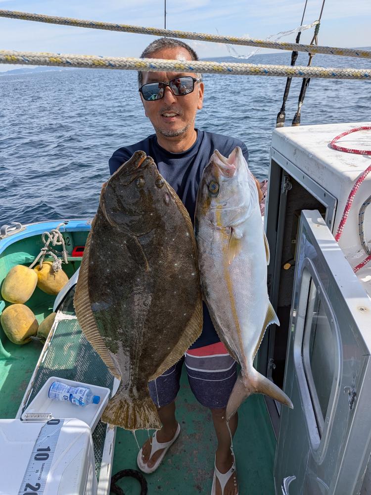 今日はサビキ隊、天秤隊両者いましたがサビキ隊はベイトが針掛かりすればアタリ出ましたがベイトの掛かり悪く天秤仕掛けの方が優勢の感じでした。今日は両方共にテクニックがで釣れ具合が差がついた感じでしたが全員2本以上ゲットできお土産バッチリ、イナダはほとんどが50センチ前後と良型揃いました。スペシャルゲストにマダイ4.6キロ、ヒラメ1.9キロソーダ類、金アジ、ウルメ交じり。また出たら頑張ってみますので宜しくお願い致します。食わせサビキでもいいですがベイト付かない時は天秤仕掛けに