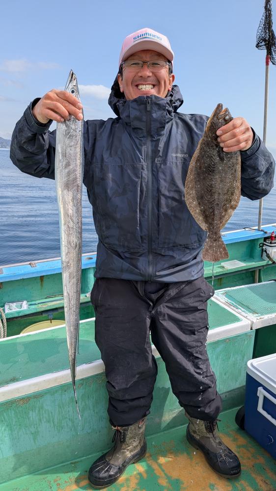 今日はお客様2名様で出ました。朝のウチ小アジ釣りは顔見るも動き早くお客様お二人様共にマイワシ餌でやってくれました。最初のウチはアタリ中々出ずでしたが各ポイント探ってるうちに顔見れその後もやるとアタリ出てくれお一人様はアタリ出ると掛けてくれコンスタントに拾ってくれ4枚、マゴチ、もうお一人様はビックリしてアワセてしまい何とか1枚ゲット、他にバラシもありで反省してました。次回も頑張って下さい。その後探索してると怪しい反応がやるとハリス切れ、いましたタチウオです。反応もしっかり出てくれてましたがバレやハリス切れ、イワシの首チョンパなど多数、お二人様共に1本ずつゲット出来ました106ー108センチのメーターオーバーでした。去年も浅場でタチウオ釣れましたのでこちらも油断禁物です。また出たら頑張ってみますので宜しくお願いします。