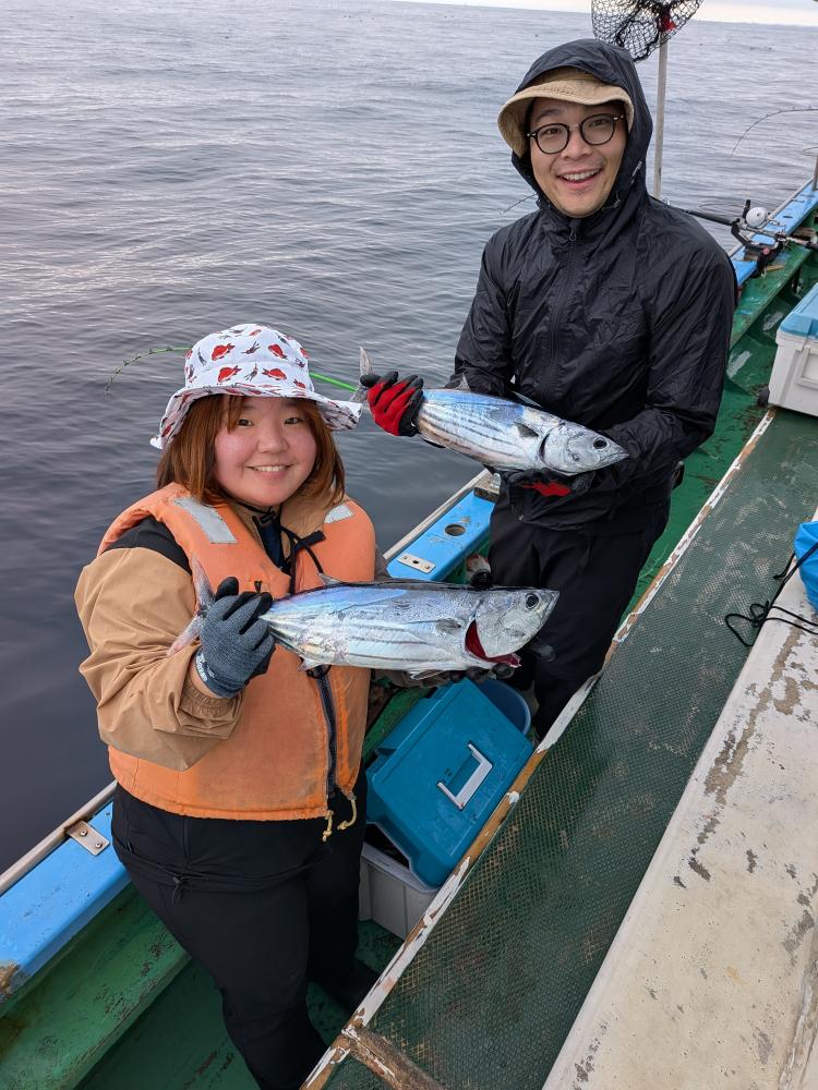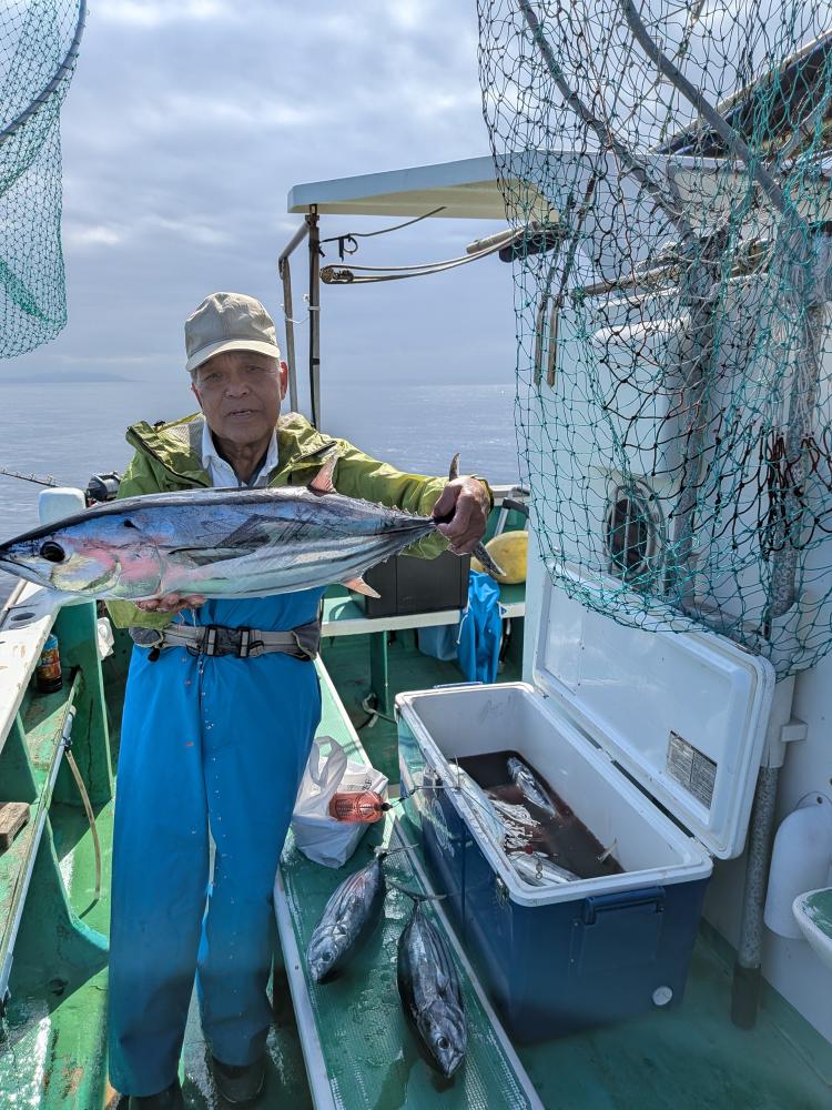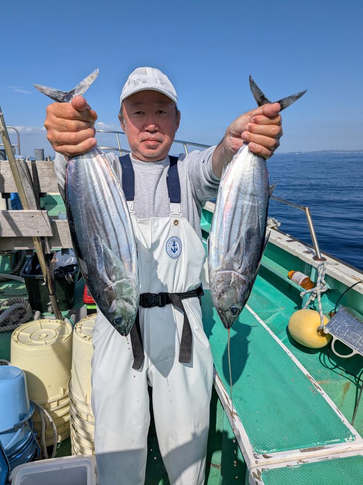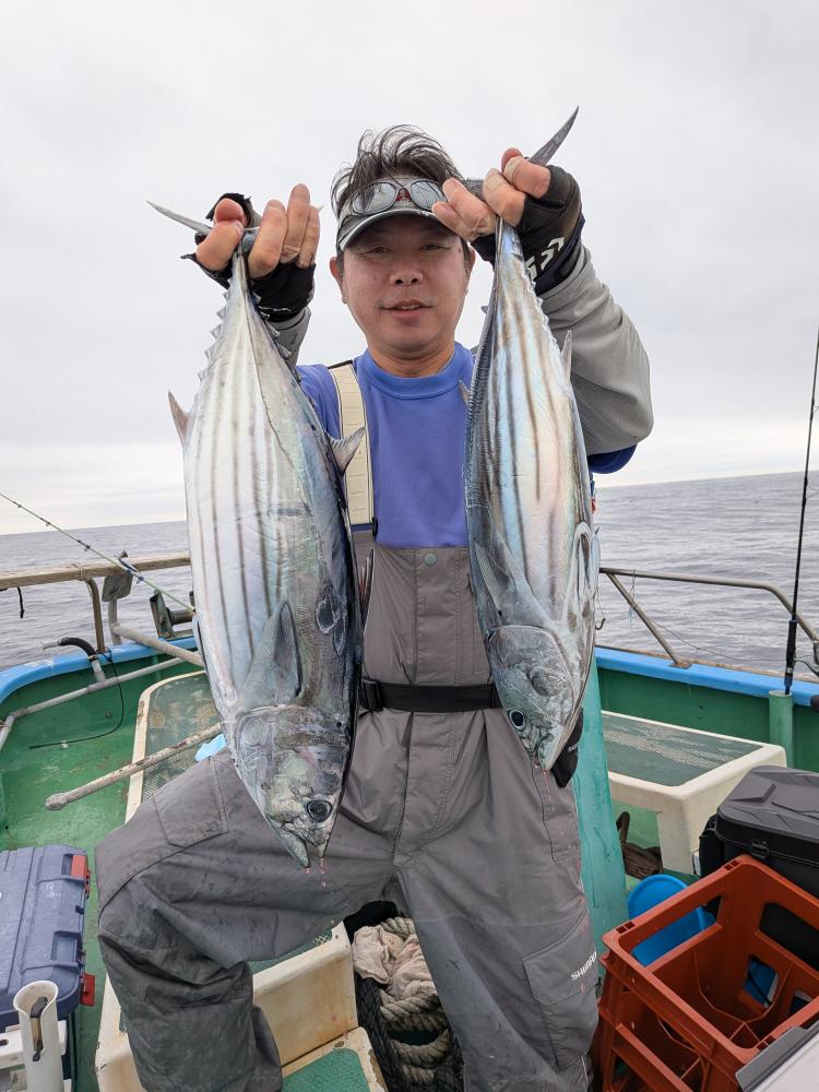 朝から僚船の模様でカツオの跳ね見させて頂きすぐカツオ顔見れ、その後もやり変えたまにカツオヒットしてくれマグロ狙ったお客様3回アタリ出てくれ12.6〜15.4キロ0〜2本1匹はサメに食われ頭だけ。カツオは0〜7本、1.2〜3.1キロ。バラシ多数。ジギング2名様で0〜5本0のお客様はバラシ。