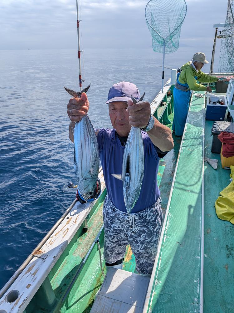サバ釣り アジ イトヨリ カイワリ ソーダ混じり引き皆様に楽しんでいただき 後半はイナダ狙いに行き ベイトかかってイナダの連発 3人同時ヒットなどあってカワハギ カサゴ 良型オオモンハタなどまざりあたりありました