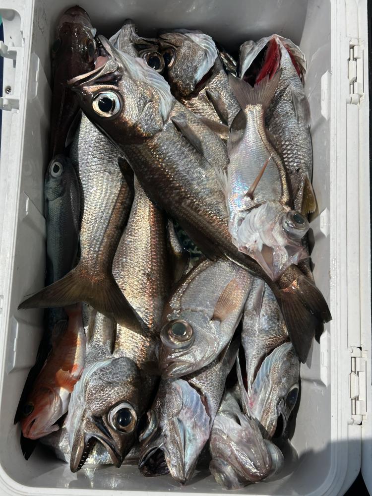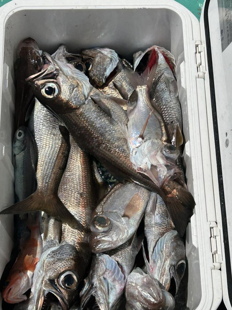 金目鯛 白ムツ メダイまじりに飽きない程度にあたり出て終わって見れば皆様お土産になりました 今日の様にお魚発見出来れば釣れること期待して明日も行きましょう チャレンジお待ちしてますね 他にサバ 夢カサゴ つのめさめ等
