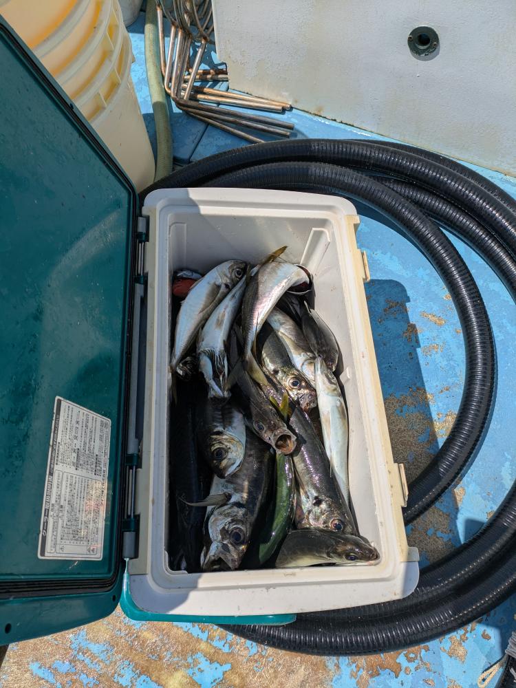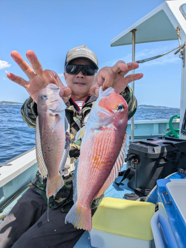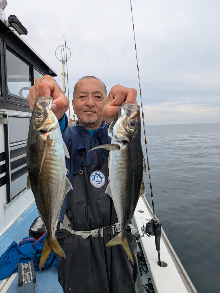 今日は早川船長お休みで代打で出ました。お客様もスッ空っぽでお二人様で朝からお一人様は電動リールのコード忘れもうお人様もミチイト足りずのハプニング続きからスタート、朝のうち浅場のクロダイ、はなだい、アジ狙いましたが各ポイント反応あるも難易度高いか、お客様の仕掛けが合ってないみたいで小アジのみで……その後少し深いポイントでアジ、サバ、アマダイ狙う事に……反応は出入りするもコマセ効かずダブルとかでも釣れて来ますが連発出来ずでしたがお土産になりアマダイは不発というより………後半メジナ狙いに行きましたが不発でイサキ、タカベはサビキ釣りで入れ食い多点掛けありで短時間でお土産になりました。その時狙う魚で仕掛けは変わりますので船長の指示に従って下さい。特にタカベ、イサキはサビキ釣りの方が簡単に釣れます。皮付きか空針サビキでお願い致します。ハリス2号位。アジ、サバ、クロダイ、メジナなどはウィリープラス下針が空針のハリス3号位、