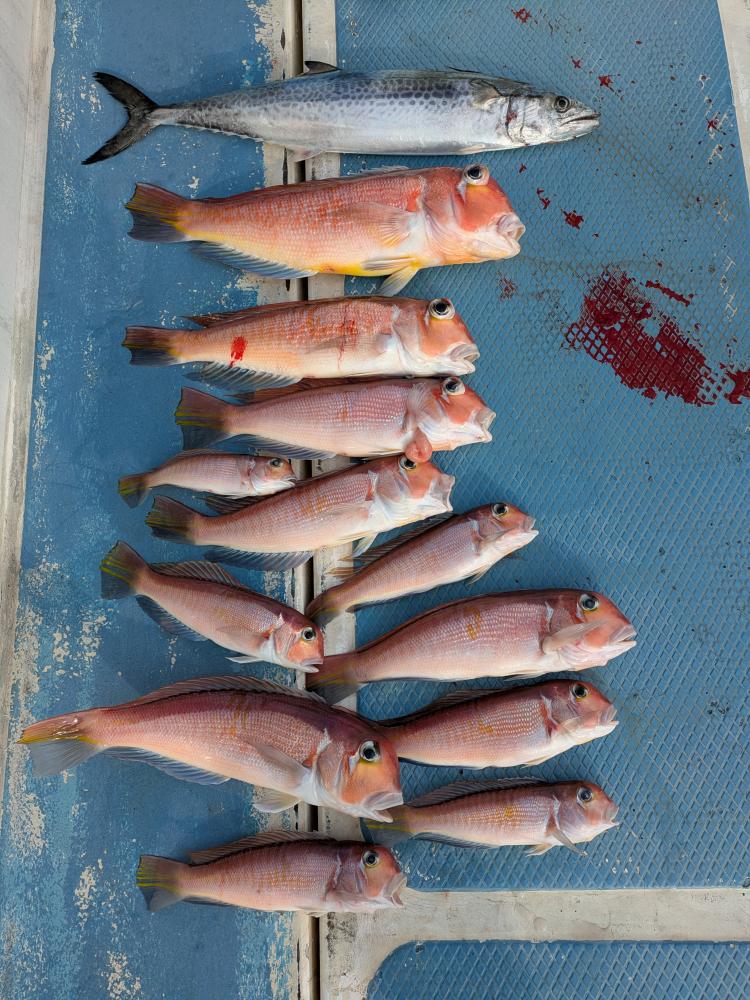 中盤に移動後金目鯛白ムツポチとあたりサバ混じり 後半はクロムツ顔見ていないお客様がいたのでクロムツおいかけたのですが船中数匹とシロムツで失速