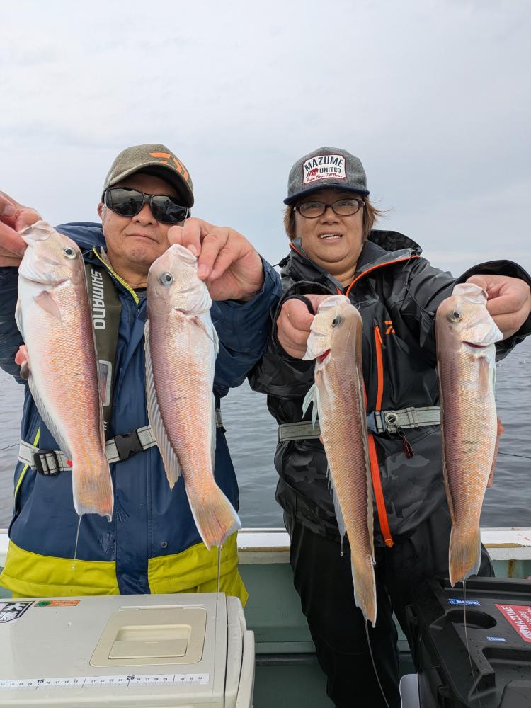 今日は小型主体ながらもポッツリポッツリ釣れ、白アマダイも船中7匹でました。